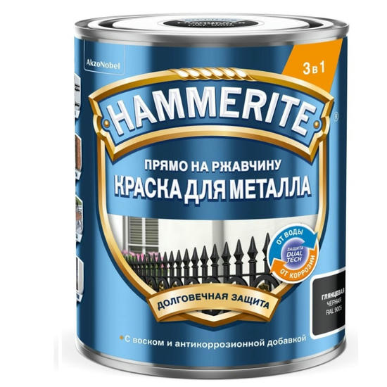 Краска для металлических поверхностей Hammerite гладкая RAL 9005 черная 2 л – гладкая глянцевая прямо по ржавчине Hammerite с формулой 3 в 1 (грунт, ингибитор коррозии, финишное покрытие). Имеет в своем составе антикоррозийные и силиконовые добавки. Применяется для цветных и черных металлов, легко и быстро защищает металл от ржавчины, придает красивый внешний вид поверхности. Краска свободно наносится и гарантирует прочное антикоррозийное покрытие и эффективную защиту от ржавчины на протяжении 8 лет.