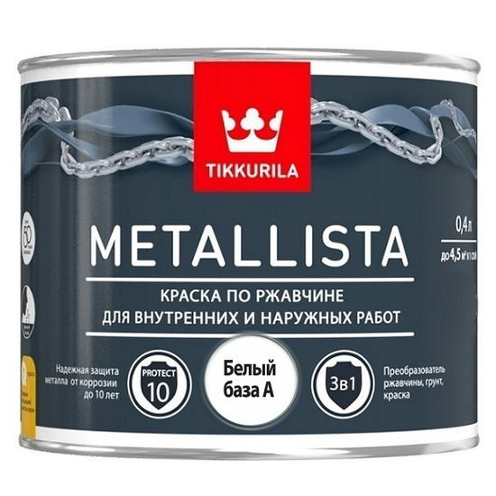 Краска по ржавчине Tikkurila Metallista база A – специальная атмосферостойкая краска по ржавчине, которая сочетает в себе свойства преобразователя ржавчины, антикоррозионной грунтовки и декоративного финишного покрытия. Позволяет легко проводить окраску металлических поверхностей без тщательной очистки от ржавчины и дополнительного использования грунтовки.