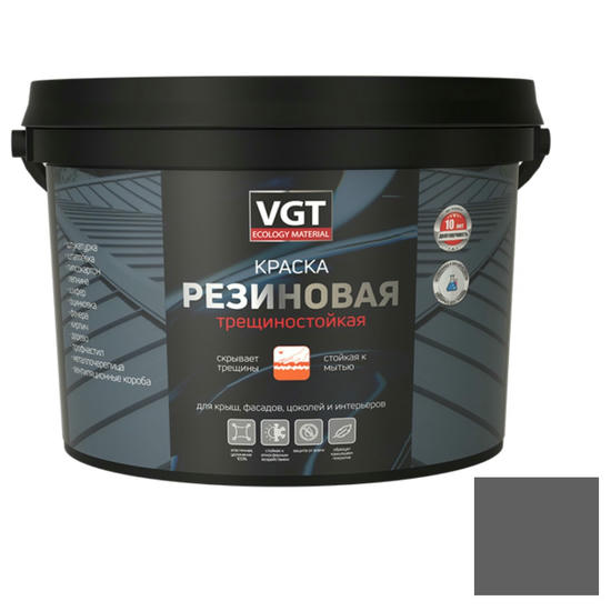 Краска резиновая трещиностойкая VGT графитовая RAL7024 40 кг предназначена для создания эластичного, водостойкого декоративно-защитного покрытия внутри и снаружи помещений, в т.ч. на поверхностях, подверженных трещинообразованию (например, новые здания, которые ещё не претерпели усадку).
