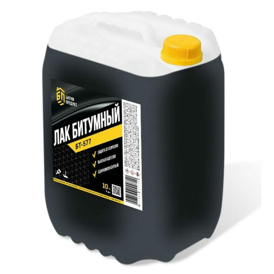 Лак битумный Битум Продукт БТ-577 BP-0011 10 л представляет собой материал на основе битума, который используется для предотвращения коррозии металлических поверхностей и обеспечения водонепроницаемости.