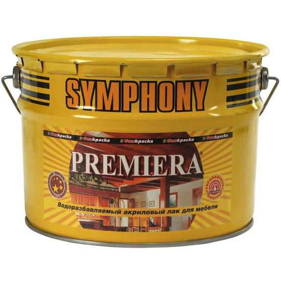 Лак мебельный Symphony Premiera шелковисто-матовый база EP 10/9 л – экологически чистый водоразбавляемый акриловый лак «Premiera» с усиленной защитой против ультрафиолета, с высокой химической стойкостью и износостойкостью.