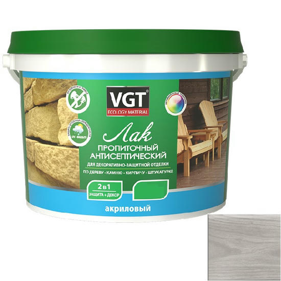 Лак пропиточный антисептический VGT дуб светло-серый 9 кг предназначен для защиты от гниения и пропитки деревянных поверхностей, кирпича, природного и искусственного камня. Представляет собой гомогенную вязкую жидкость со слабым запахом. При полном высыхании лак образует прозрачную, эластичную, прочную пленку. От других лаков данный материал отличает большая глубина проникновения в слой древесины, что обеспечивает более длительную защиту древесины от гниения. Может использоваться для наружных и внутренних работ. Выпускается несколько цветов.