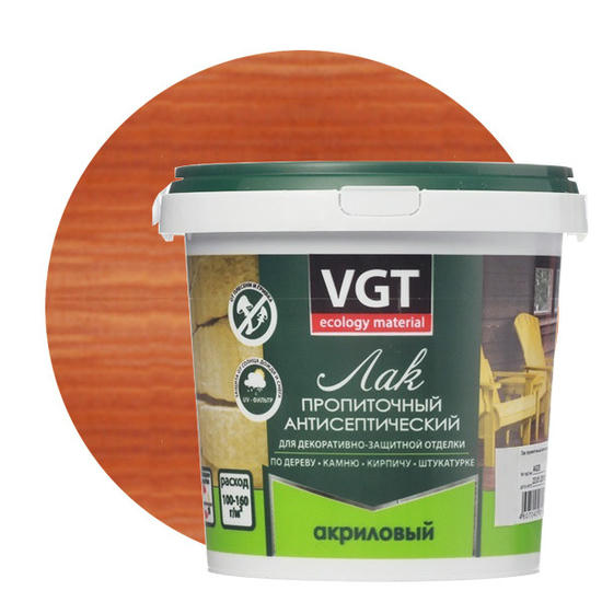 Лак акриловый пропиточный с антисептиком VGT махагон предназначен для глубокой пропитки и защиты деревянных поверхностей (кроме полов) от гниения. Его используют также для декоративной отделки и защиты кирпичных, бетонных и других минеральных оснований, а также природного и искусственного камня от грибков, водорослей, плесени.