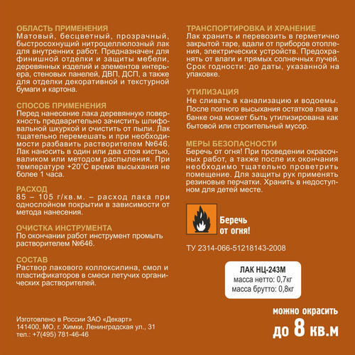 Матовый, бесцветный, прозрачный, нитроцеллюлозный лак НЦ -243 М для внутренних работ. Предназначен для финишной отделки и защиты мебели, деревянных изделий и элементов интерьера, стеновых панелей, ДВП, ДСП, а также для отделки декоративной и текстурной бумаги и картона.