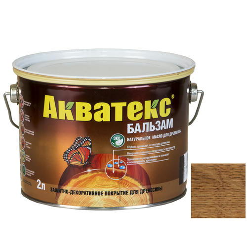 Акватекс Бальзам – натуральное масло для древесины. Применяется для защиты древесины от защита древесины:от биопоражений (гниения, плесени, грибка, синевы), УФ-излучения (потемнения, выгорания), атмосферных воздействий, а также как декоративная отделка под ценые породы дерева.
