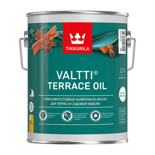 Tikkurila Valtti Terrace oil – органоразбавляемое масло содержащее воск для защиты и отделки новых или обработанных ранее маслом деревянных поверхностей снаружи помещений. Предназначено для защиты и отделки новых или обработанных ранее маслом деревянных поверхностей (террасы, лестницы, садовая мебель), пропитанной (под давлением) и термообработанной древесины, поверхностей из твердых или ценных пород дерева снаружи помещений.