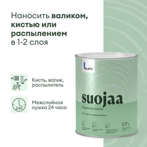Алкидная пропитка на масляной основе с добавлением воска для террас и садовой мебели. Назначение. Для защитно-декоративного покрытия настилов, террас, причалов и садовой мебели и других конструкций из дерева на улице. Состав: уайт-спирит, льняное масло, алкидная смола, добавки. Инструкция по применению. 1. Подготовка поверхности. Сухую поверхность очистить от смолы, обработать шлифовальной бумагой Р80-Р120, удалить пыль. Ремонтируемые поверхности расчистить от отслаивающегося старого покрытия и отшлифовать. 2. Условия выполнения работ. Температура воздуха, пропитки и изделия должна находиться в интервале от 10°С до 25°С при относительной влажности воздуха не более 80%. 3. Окрашивание. Нанести масло кистью, валиком или распылителем в 1-2 слоя до насыщения поверхности, через 20-30 минут удалить избыток масла ветошью. При нанесении распылением состав сразу разравнивать по поверхности кистью или валиком. Перерыв между слоями не нормируется, определяется скоростью впитывания. Длинномерные элементы конструкции обрабатывать непрерывно по всей длине. 4. Уход за покрытием. Покрытие высыхает при нормальных условиях за 48 часов. Удалять загрязнения в процессе эксплуатации можно через месяц после нанесения промывкой водой. Возобновляют покрытие по мере износа повторным нанесением масла, колерованного или прозрачного.