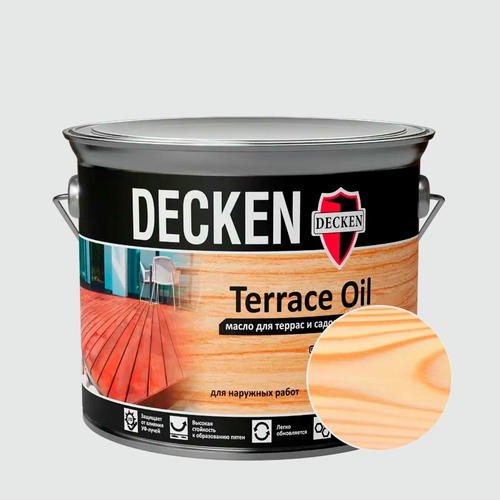 Масло прозрачное покрытие премиум класса. Предназначено для обработки террас и садовой мебели. Высокое содержание натуральных восков в составе масла позволяет придавать поверхности стойкость к истиранию и пятнообразованию. Масло воск DECKEN Terrace Oil используется для защиты поверхностей террасы, садовая мебель, балконы, веранды, беседки.