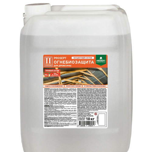 Prosept огнебиозащита – состав пропиточный “Prosept огнебиозащита II” – комплексная огнебиозащитная пропитка для древесины, используется внутри помещений и на открытом воздухе без прямого воздействия атмосферных осадков и контакта с грунтом. Пропитка защищает от возникновения и распространения огня, а также от воздействия насекомых и грибков. Переводит древесину в трудногорючий материал. Подходит для обработки как новых конструкций, так и ранее обработанных огнезащитными составами. Пропитка устойчива к старению, не высаливается и не выщелачивается. Не оказывает негативного воздействия на свойства древесины, не изменяет ее структуру, не препятствует дальнейшей обработке, склеиванию и окраске любыми ЛКМ. При обеспечении невымываемости препарата, срок защиты составит не менее 7 лет. Подтверждено тестами.