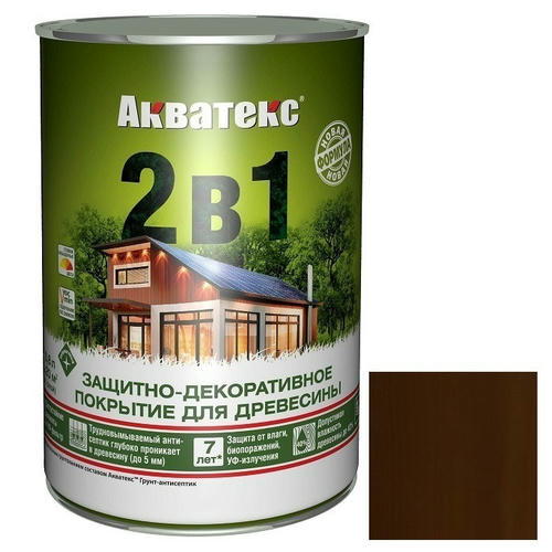Покрытие алкидное защитно-декоративное для древесины Акватекс 2 в 1 применяется для защиты древесины от атмосферных воздействий, УФ-излучения и биопоражений: гниения, плесени, грибков, древесной синевы, а также от заражения деревопоражающими насекомыми. Подходит для декоративной обработки древесины под ценные породы.