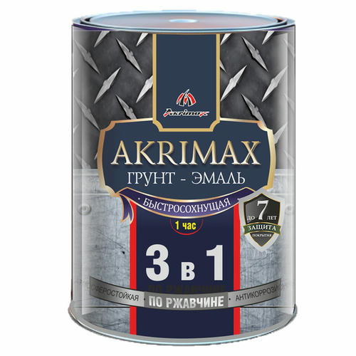 Быстросохнущая грунт-эмаль по ржавчине 3 в 1 Akrimax-Premium (матовая; графит), 0,8 кг используется для защиты и окраски как чистых, так и ржавых или частично прокорродировавших металлических поверхностей, эксплуатируемых как снаружи, так и внутри помещений. Применяется для окраски поверхностей, очистка которых от ржавчины затруднена в силу ряда причин: крупных габаритов изделия, сложного профиля, недостатка времени и т.д.