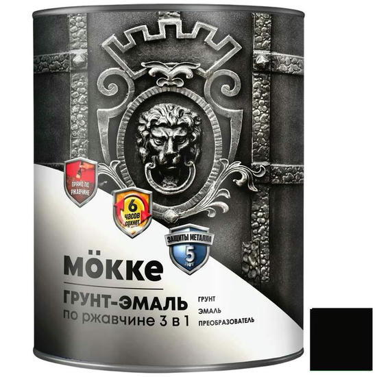 Грунт-эмаль алкидно-уретановая Mokke 00992 3 в 1 черная 2,7 кг – предназначена для покрытия чистых и ржавых металлических поверхностей. Материал сочетает в себе свойства трех продуктов: преобразователя ржавчины (прекращает развитие ржавчины на металле), антикоррозийного грунта и декоративной эмали. Благодаря составу, грунт-эмаль равномерно распределяется по основанию и образует прочное покрытие, устойчивое к атмосферным воздействиям и влаге.
