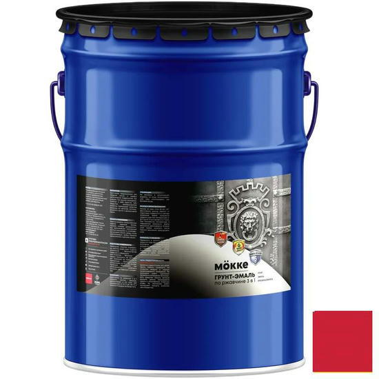 Грунт-эмаль алкидно-уретановая Mokke 04599 3 в 1 красная 20 кг – предназначена для покрытия чистых и ржавых металлических поверхностей. Материал сочетает в себе свойства трех продуктов: преобразователя ржавчины (прекращает развитие ржавчины на металле), антикоррозийного грунта и декоративной эмали. Благодаря составу, грунт-эмаль равномерно распределяется по основанию и образует прочное покрытие, устойчивое к атмосферным воздействиям и влаге.