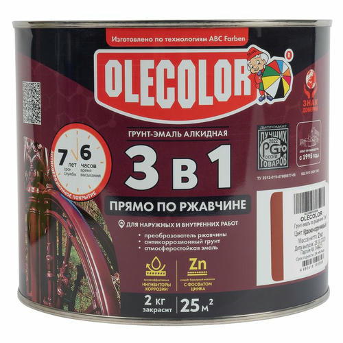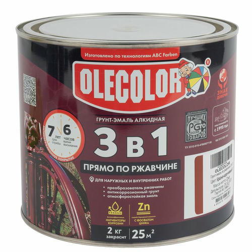 Формула грунт-эмаль по ржавчине 3 в 1 Олеколор отличается долговечностью, надежностью, устойчивостью к воздействию влаги и ультрафиолетовых лучей.