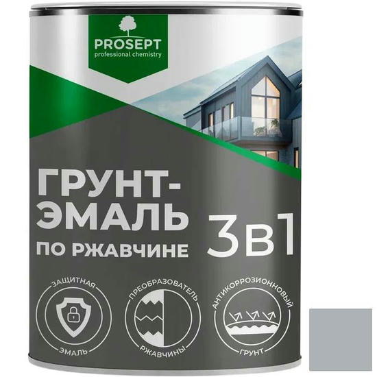 Грунт-эмаль по ржавчине 3 в 1 Prosept 097-09 серая 0,9 кг – предназначена для окраски чистых и прокорродированных металлических поверхностей с толщиной прочно связанной ржавчины до 100 мкм (ограды, решетки, гаражи, ворота, заборы из профлиста и другие металлические конструкции), а также для обработки бетонных и деревянных поверхностей. В состав средства входят специальные противокоррозионные компоненты, преобразующие ржавчину в прочный защитный слой, а также препятствующие дальнейшей коррозии. Обладает высокими показателями адгезии к новым ранее окрашенным и ржавым поверхностям.