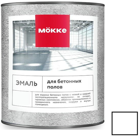 Эмаль акриловая для бетонных полов Mокке 10217 белая 2,7 кг предназначена для окраски бетонных полов с низкой и средней эксплуатационными нагрузками: на складах, гаражных комплексах, объектах промышленного и гражданского назначения, снаружи и внутри помещения.