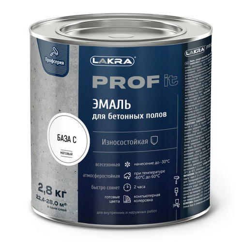 Износостойкая матовая эмаль для бетонных полов на основе синтетических смол. Образует суперпрочное покрытие, стойкое к атмосферным воздействиям. Обладает повышенной износостойкостью, низкой истираемостью, а также устойчивостью к действию воды, моющих средств, растворов солей, масел, бензина. Выдерживает многократное мытье без потери свойств. Возможно применение при отрицательных температурах до -30°С. Выдерживает эксплуатацию в интервале температур от -60°С до 60°С. Для использования в качестве белой эмали и для колеровки в светлые и пастельные тона.