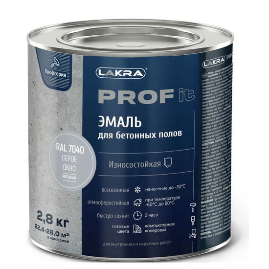 Эмаль для бетонных полов быстросохнущая Лакра Prof it RAL 7040 серое окно 2,8 кг износостойкая матовая эмаль для бетонных полов на основе синтетических смол образует суперпрочное покрытие, стойкое к атмосферным воздействиям. Обладает повышенной износостойкостью, низкой истираемостью, а также устойчивостью к действию воды, моющих средств, растворов солей, масел, бензина. Выдерживает многократное мытье без потери свойств. Возможно применение при отрицательных температурах до -30°С.