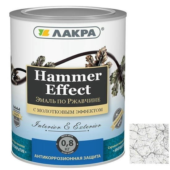 Эмаль по ржавчине Лакра Hammer Effect молотковая серебро – высококачественная эмаль на основе алкид-стирольной смолы, сочетает в себе свойства антикоррозионного грунта и декоративной эмали. Применяется для защиты и окраски как чистых, так и ржавых или частично прокорродированных металлических поверхностей с толщиной плотнодержащейся ржавчины до 0,1 мм, а также деревянных поверхностей для создания “молоткового” эффекта. После высыхания образует глянцевое покрытие с характерным рисунком чеканки (молотковый эффект), скрывающее мелкие дефекты поверхности.