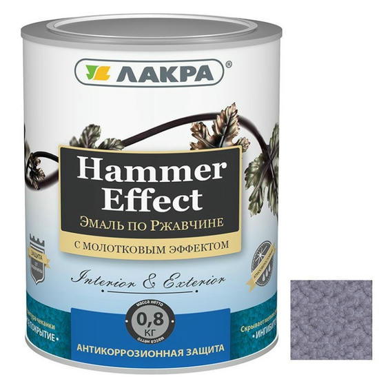 Эмаль по ржавчине Лакра Hammer Effect молотковая синяя – высококачественная эмаль на основе алкид-стирольной смолы, сочетает в себе свойства антикоррозионного грунта и декоративной эмали. Применяется для защиты и окраски как чистых, так и ржавых или частично прокорродированных металлических поверхностей с толщиной плотнодержащейся ржавчины до 0,1 мм, а также деревянных поверхностей для создания “молоткового” эффекта. После высыхания образует глянцевое покрытие с характерным рисунком чеканки (молотковый эффект), скрывающее мелкие дефекты поверхности.