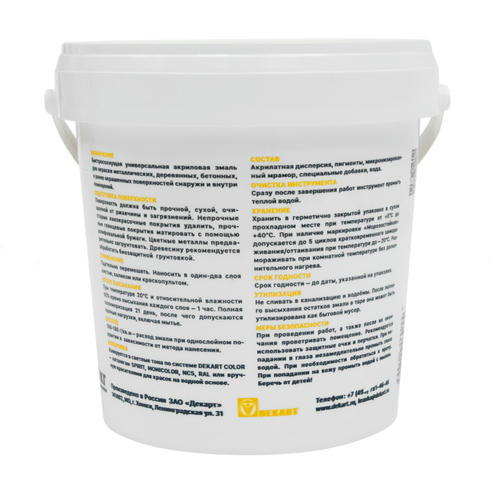 Быстросохнущая универсальная акриловая эмаль без запаха. Для наружных и внутренних работ. Предназначена для окраски металлических, бетонных, деревянных и ранее окрашенных акриловыми или алкидными красками поверхностей. Обладает хорошей укрывистостью и не оставляет потеков.