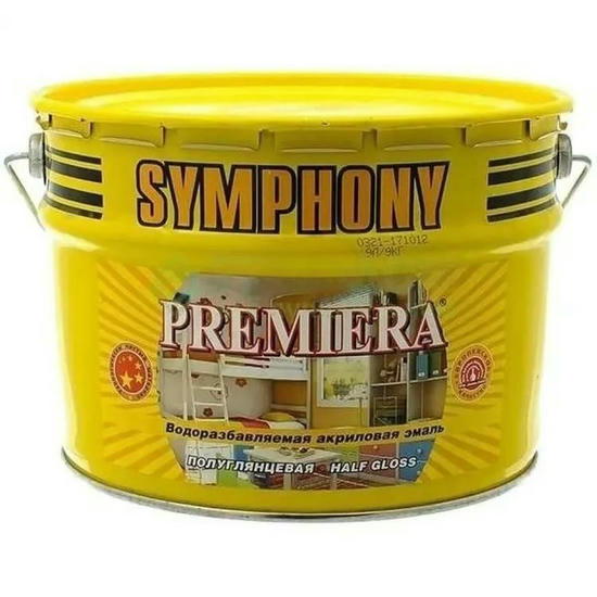 Эмаль акриловая Symphony Premiera 00-00012179 А полуглянцевая в металлическом ведре 2,7 л – предназначена для окраски деревянных, металлических, бетонных и др. поверхностей в сухих и влажных помещениях. Применяется для окраски мебели, окон, дверей, радиаторов отопления и т.п., в том числе в детских, дошкольных, школьных, лечебно-профилактических учреждениях, больницах. Обладает отличной стойкостью к мытью и истиранию. Можно наносить на новые и ранее окрашенные алкидными и в/д красками поверхности. Эмаль перед применением тщательно перемешать, при необходимости можно разбавить водой на 5-10%. Наносить кистью, валиком или распылителем в 1-2 слоя с межслойной сушкой в течение 4 часов. Во избежание разницы в оттенке колерованной эмали при окраске больших поверхностей рекомендуется смешивать достаточное количество эмали в одной емкости.