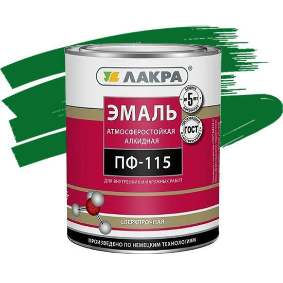 Эмаль Лакра ПФ-115 темно-зеленая – высококачественная эмаль на основе алкидного лака. Обладает хорошими декоративными свойствами, укрывистостью и прочным сцеплением с окрашиваемой поверхностью. Легко наносится, образуя однородное гладкое покрытие, устойчивое к действию воды, атмосферных осадков и растворов моющих средств. Готова к применению.