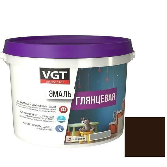 Эмаль универсальная VGT глянцевая предназначена для окрашивания снаружи и внутри помещений, в т.ч. для которых предусмотрен режим влажной дезинфекции, во всех типах зданий и сооружений (А-В) по бетону, кирпичу, штукатурке, древесине, гипсу, гипсокартону, ДВП, ДСП, обоям и другим поверхностям.