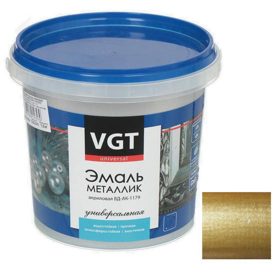 Эмаль универсальная VGT металлик золото 10 кг предназначена для декоративной окраски различных поверхностей (минеральных, дерева, гипса, керамики, различных типов обоев, изделий из полистирола и пластика, алюминия, оцинковки). Предназначена для декоративной окраски различных поверхностей: дерева, гипса, керамики, различных типов обоев, изделий из полистирола и пластика, загрунтованного металла. Применяется для наружных и внутренних работ во всех типах зданий и сооружений (А-В), в т.ч. для которых предусмотрен режим влажной дезинфекции.