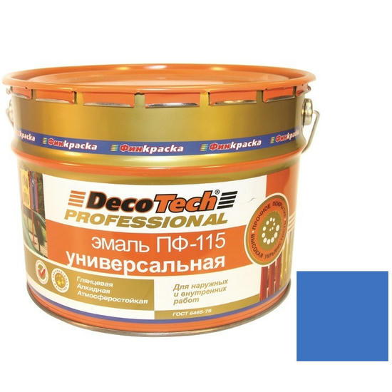 Эмаль DecoTech Professional ПФ-115 голубая – универсальная глянцевая алкидная эмаль. Предназначена для окраски наружных и внутренних металлических, бетонных, деревянных и древесно-стружечных поверхностей. Применяется для окраски металлоконструкций, лодок, вывесок, мебели, дверей, оконных переплетов, стен, потолков, полов, подвергающихся умеренному механическому и химическому воздействию в жилых, торговых, складских помещениях, подвалах, балконах, гаражах, в том числе в детских, дошкольных, школьных, лечебно-профилактических учреждениях, больницах и на предприятиях пищевой промышленности для поверхностей, не имеющих непосредственного контакта с пищевыми продуктами.