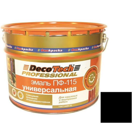 Эмаль DecoTech Professional ПФ-115 черная – универсальная глянцевая алкидная эмаль. Предназначена для окраски наружных и внутренних металлических, бетонных, деревянных и древесно-стружечных поверхностей. Применяется для окраски металлоконструкций, лодок, вывесок, мебели, дверей, оконных переплетов, стен, потолков, полов, подвергающихся умеренному механическому и химическому воздействию в жилых, торговых, складских помещениях, подвалах, балконах, гаражах, в том числе в детских, дошкольных, школьных, лечебно-профилактических учреждениях, больницах и на предприятиях пищевой промышленности для поверхностей, не имеющих непосредственного контакта с пищевыми продуктами.