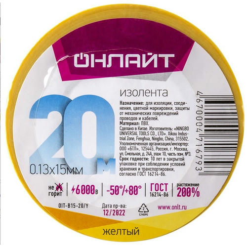 Изолента ПВХ Онлайт OIT-B15-20/Y желтая 15 мм 20 м представляет собой изоляционную клейкую ленту шириной 15 мм, толщиной 0,13 мм, изготовленную из термостойкого (до 80 С), самозатухающего поливинилхлорида, желтого цвета.