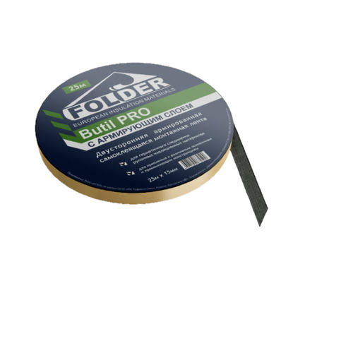Лента герметизирующая FOLDER Butil Pro из бутилкаучука с армирующим слоем из стеклосетки применяется для соединения между собой полотен изоляционных материалов и герметизации мест примыкания изоляционных материалов к оконным и дверным проемам, к трубам и вентиляции, стропильным конструкциям.