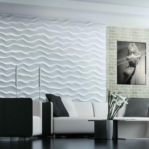 Стены, декорированные этими панелями, напоминают песчаные волны горячей пустыни или легкую рябь на гладкой поверхности бескрайнего океана. Если Вы хотите усилить этот эффект, достаточно окрасить декоративные панели в соответствующий цвет – синий или песочный, используя плавный переход оттенка от темного к более светлому. Интерьер можно дополнить мебелью с лаконичным дизайном и оригинальными комнатными растениями.