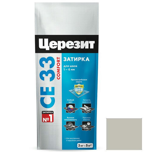 Затирка цементная Ceresit СЕ33 Comfort серебристо-серая – затирка с противогрибковым эффектом для швов плиточных облицовок шириной до 6 мм. Предназначена для заполнения швов керамических и каменных облицовок, устроенных на недеформирующихся основаниях (таких как бетон, цементные стяжки и штукатурки), на полах и стенах внутри и снаружи зданий. Может применяться в небольших крытых бассейнах.