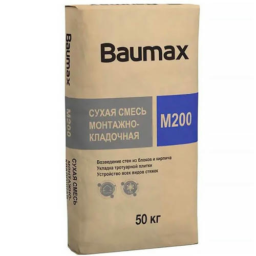 Смесь сухая монтажно-кладочная Baumax М-200 предназначена для выполнения общестроительных работ: устройство стяжек; заделка швов, трещин, выбоин, углублений; возведения стен и конструкций из полнотелого рядового кирпича, полнотелых бетонных блоков и природного камня. Для наружных и внутренних работ.