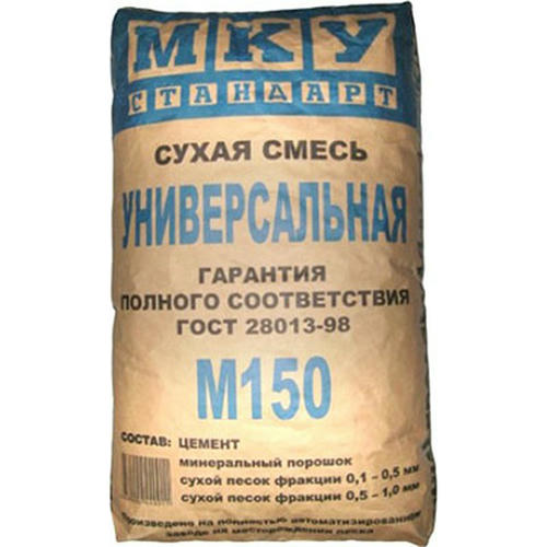 Сухая смесь универсальная МКУ стандарт на основе портландцемента и песка, предназначена для широкого спектра работ: штукатурка стен, бетонирование полов, устройство легких фундаментов, кладка кирпичей и бетонных блоков, ремонт и заделка швов, укладки тротуарной плитки и прочих. Область применения: проведение строительных и ремонтных работ внутри и снаружи помещений.