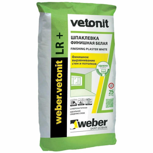 Шпатлевка Weber Vetonit LR+ (Россия) на полимерном связующем предназначена для отделки стен и потолков в сухих помещениях.