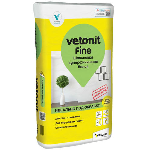 Шпатлевка суперфинишная Vetonit Fine белая 25 кг суперфинишная шпаклевка на полимерном связующем предназначена для экстра качественной подготовки стен под последующую окраску. Может применяться даже без слоя готовой шпаклевки поверх себя. Мельчайшая фракция зерна от 0.3 мм позволяет достигнуть супер тонкого слоя и равномерного распределения на обрабатываемой поверхности. После шлифовки приобретает зеркальную гладкость. Для внутренних работ в сухих помещениях.