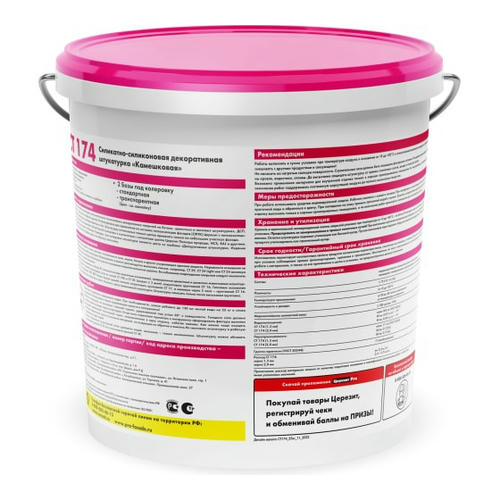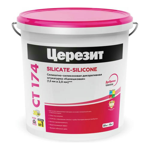 Штукатурка силикатно-силиконовая декоративная Ceresit CT 174 Камешковая 1,5 мм предназначена для изготовления тонкослойных декоративных покрытий с зернистой фактурой на бетоне, цементных и гипсовых штукатурках, гипсокартоне, древесностружечных плитах и т.д. внутри и снаружи зданий.