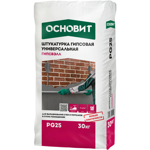 Штукатурка универсальная Основит Гипсвэлл PG25 – сухая смесь на основе гипсовой вяжущей с добавлением полимерных материалов, которые придают штукатурке пластичность, высокую адгезию, паропроницаемость. Используется для проведения отделочных работ.