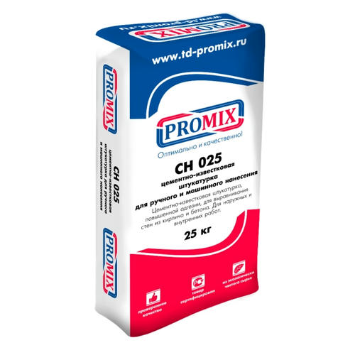 Штукатурка известково-цементная Promix CH 025 серый 25кг – имеет повышенную фиксацию к основанию. Для ручного и машинного нанесения. Пластичная гипсовая штукатурная смесь на основе природного гипса, минерального наполнителя и полимерных добавок, для выравнивания стен из бетона, газобетона, кирпича и каменных поверхностей ручным способом, внутри жилых и общественных сухих помещений с нормальным уровнем температуры и влажности.